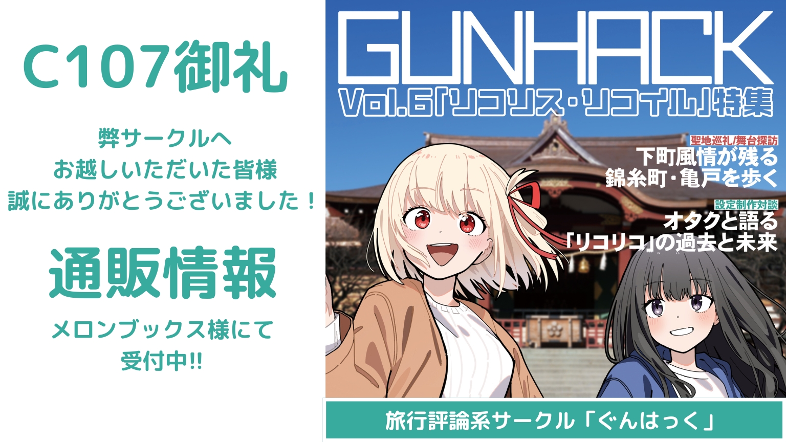 弊サークル「ぐんはっく」は、コミックマーケット107にて、新刊『GUNHACK Vol.6「リコリス・リコイル」特集』を刊行します!